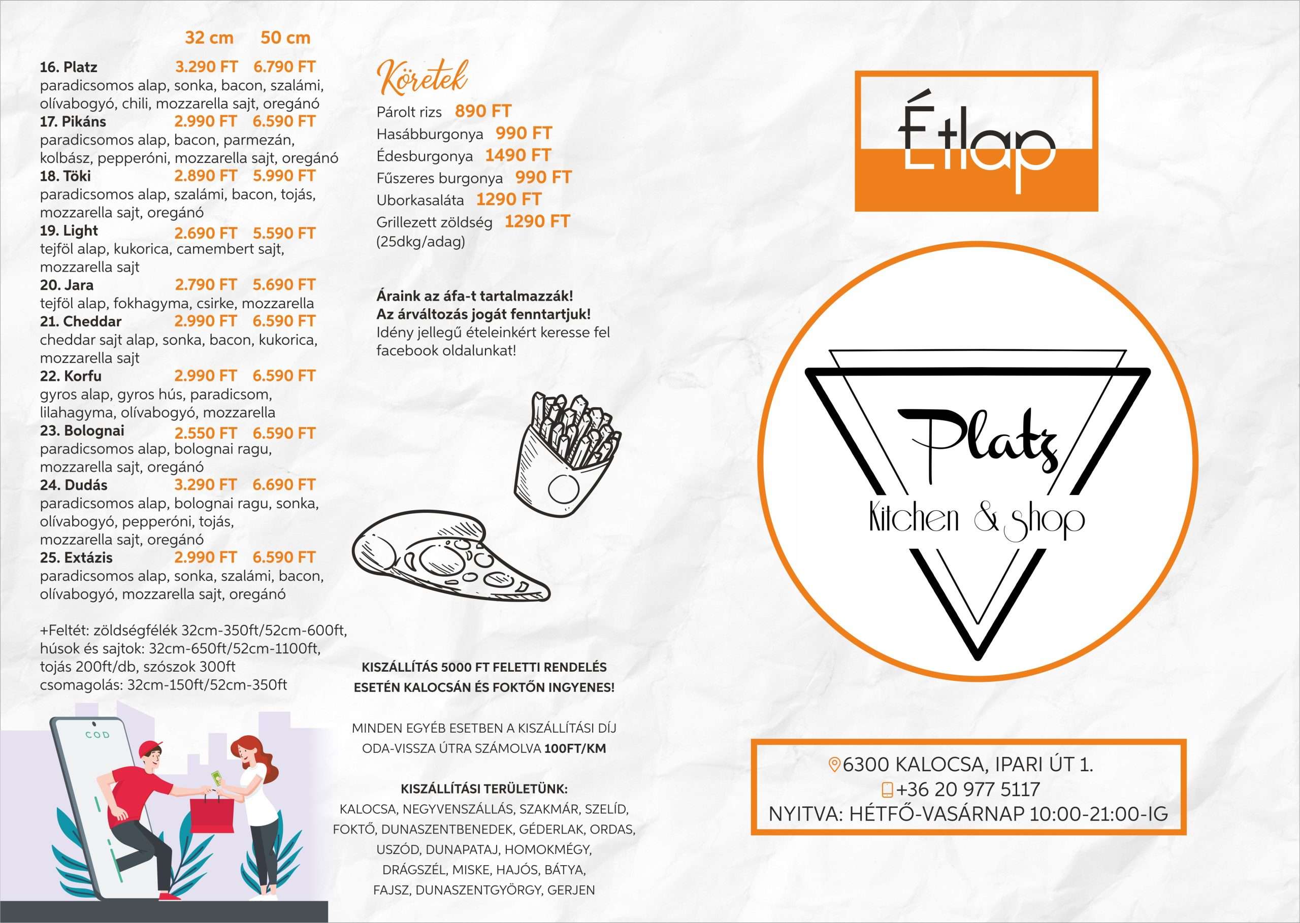 Az ételek helyben fogyasztásra, elvitelre és házhozszállítással is kérhetők. 5000 Ft feletti rendelés esetén Kalocsán és Foktőn a kiszállítás ingyenes.