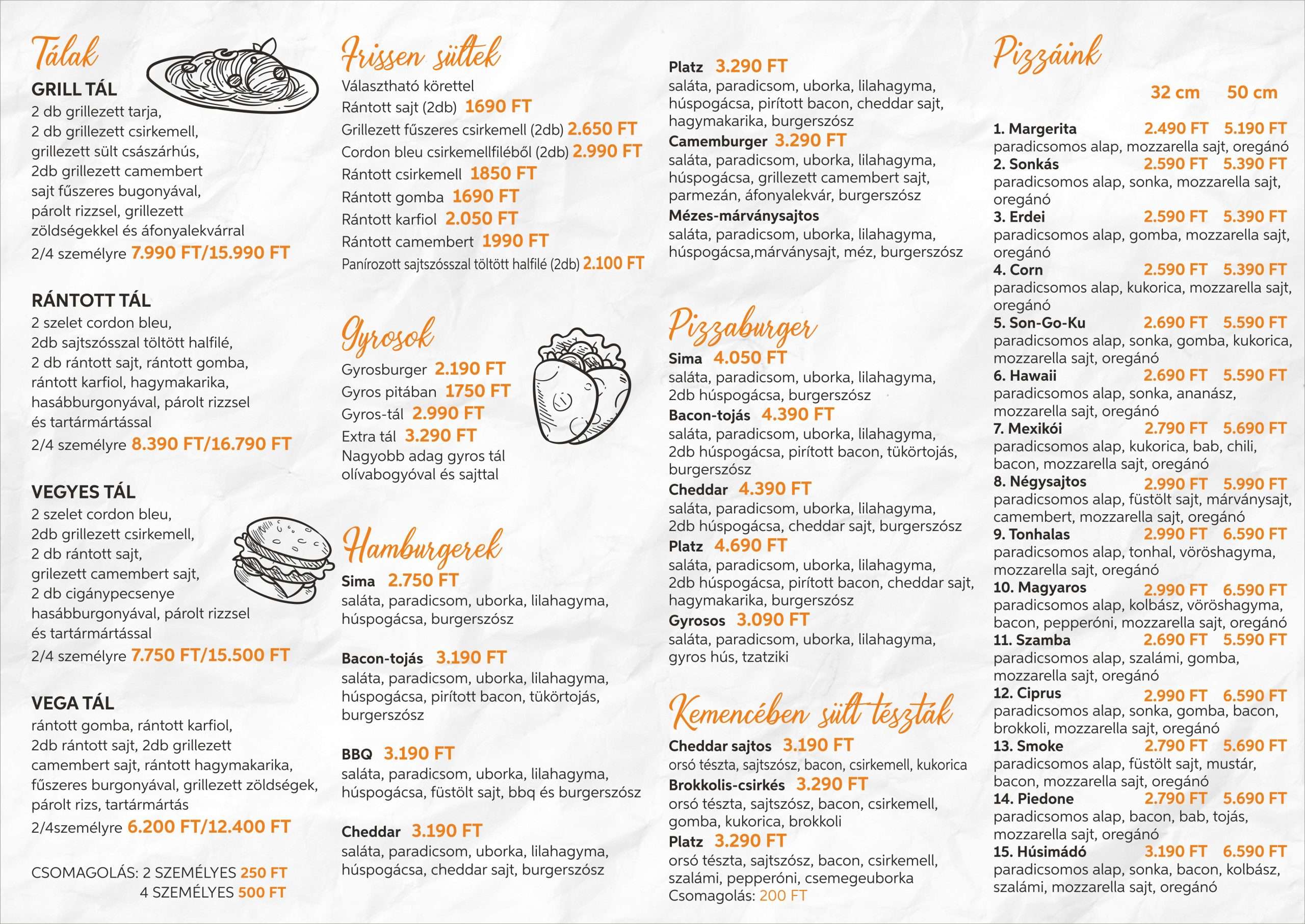 Az étlapon 32 és 50 cm-es pizzák, gyros, angus hamburgerek, frissensültek, tésztaételek és bőségtálak is szerepelnek.